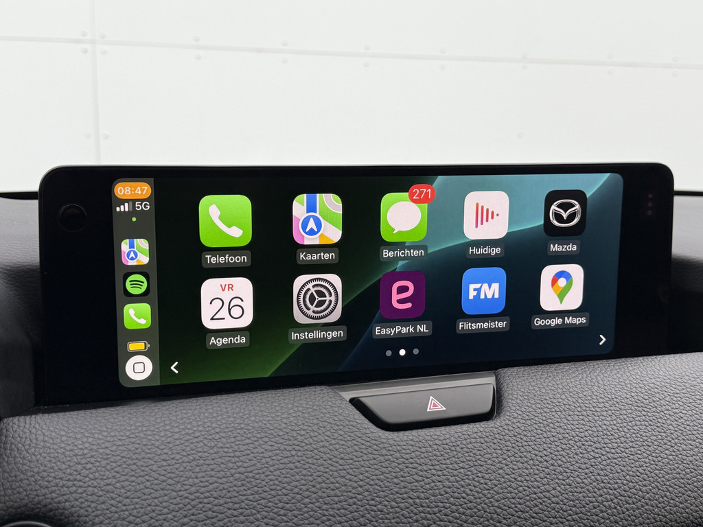 Met het digitale dashboard van deze auto is de aanpassing van uw cockpitinterface een fluitje van een cent. De vier camera's genereren samen een 360 graden beeld rond de auto, zodat u een volledig overzicht hebt van wat er rondom uw auto gebeurt. Adaptive cruise control is veilig en comfortabel. De snelheidsregelaar houdt automatisch afstand tot het voertuig dat voor u rijdt. Waar u zelf ook bent, u staat altijd in contact met de auto via de app op uw smartphone. Zo controleert u uiteenlopende functies, ook op afstand. Voor wie hoge eisen stelt aan geluid en akoestiek, is deze auto voorzien van een high performance audiosysteem. De uitrusting van deze Mazda is met dashboard met spraakbediening, full map navigatiesysteem, kruisend verkeer detectie, electronic climate control, schakelpaddles aan het stuur en draadloos opladen behoorlijk compleet.
