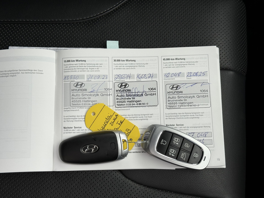 Snelheid, brandstofinfo, noem maar op. Het digitale dashboard houdt u permanent op de hoogte. Goed en overzichtelijk. De 360 graden camera biedt een beter zicht bij slechte weersomstandigheden, waardoor u beter kan anticiperen op mogelijke gevaren. Adaptive cruise control houdt de ingestelde snelheid vast en houdt afstand tot het voertuig voor u. Rijden-stilstaan, rijden-stilstaan. Niks is irritanter en vermoeiender dan filerijden. Daar heeft deze Hyundai Santa Fe een oplossing voor: de file assistent, die met radarmeting permanent het tempo aanpast op de voorligger. Zelfs als die stopt. Pech of storing, altijd vervelend. Maar met Connected Services weet u direct wat eraan scheelt. En dus ook wat er moet gebeuren. En deze auto heeft ook dashboard met spraakbediening, premium audiosysteem, full map navigatiesysteem, kruisend verkeer detectie, automatische airconditioning en schakelpaddles aan het stuur als standaard uitrusting.
